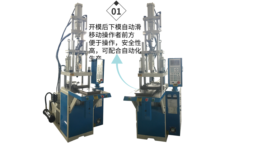 1、在V機種系列上加裝單滑模,讓機械完成一個循環(huán)動作,在關模后,下模自動滑移到操作者前方,更便于操作,安全性高且成品頂出也在外部完成。